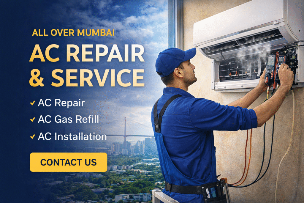 We offer professional AC repair and AC service in Byculla, Mumbai, for residential and commercial customers. Our skilled technicians work on all types of air conditioners including split AC, window AC, inverter AC, and commercial systems. We handle AC servicing, cooling issues, gas refill, water leakage problems, compressor repair, and routine AC maintenance to ensure efficient performance. Using modern tools and quality spare parts, we focus on long-lasting results and reliable cooling. Our services are designed to meet local needs in Byculla with timely support, clear pricing, and professional workmanship. If you are searching for dependable AC repair and service in Byculla, Mumbai, our experts are ready to keep your space cool and comfortable throughout the year.